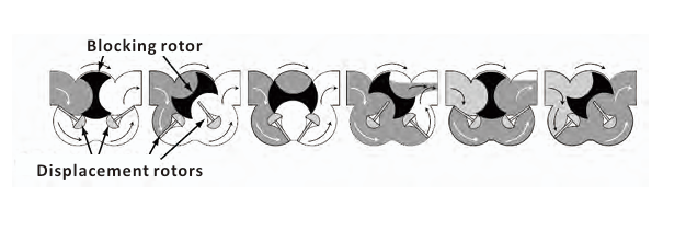At one end of each rotor shaft is a timing gear. The blocking rotor gear, having twice the number of teeth of each of the displacement rotor gears rotates at half the RPM of the displacement rotors.