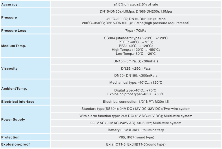 Medium Temp.: SS304(standard type): -20°C…+120°C; PTFE: -40’C…+70°C; PFA:-40°C…+120°C; High Temp.:+120’C…+450°C; Low Temp.:-80’C…-20°C